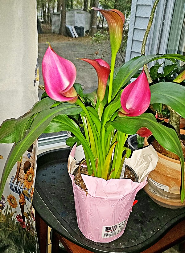 I also have another photo of our calla lily plant. It is just soooo pretty! I'm thinking though, that it might be wanting to be planted outside soon. I'll have to research this plant a bit more to see if it is ever just a house plant or if it definitely needs to be outside. Gosh, isn't this pretty?