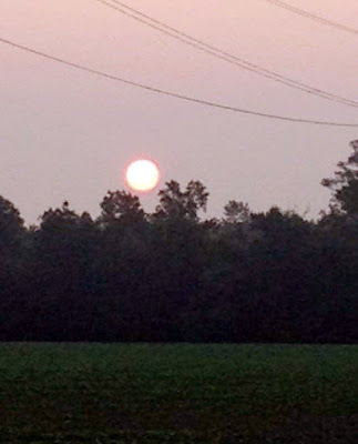 I have a photo to share that my daughter Audrey took a few days ago of a huge red sun rising early one morning on her way to work. The sun appears very bright, but you can see the red outline around it. Thanks, Audrey. It's a great shot!