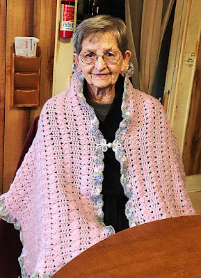 When Audrey was here last month, she had started crocheting a bed jacket. It was to be a Christmas gift for her friend Miss Bea's elderly aunt. Here is a photo she sent to me showing Miss Bea modeling the bed jacket. Audrey, her auntie is going to love this. It really came out quite lovely. Miss Bea, you're looking rather pretty too.